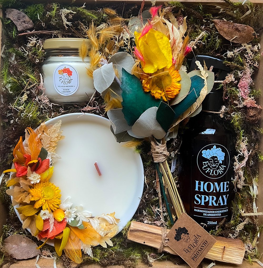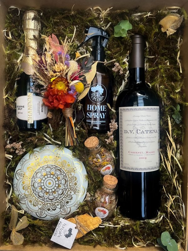 A Decoração da Caixa Afetiva é composta por palhas, musgos, folhas e flores naturais desidratadas e varia conforme as cores e variedades disponíveis.