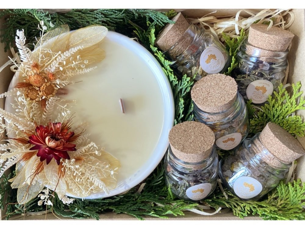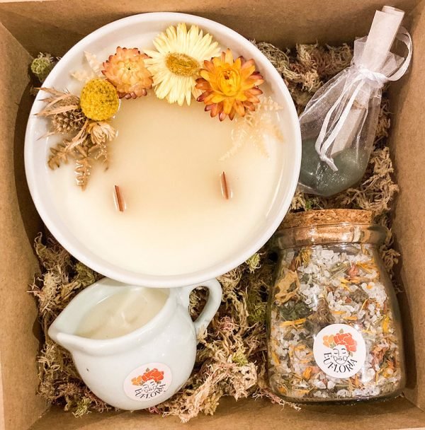 A Decoração da Caixa Afetiva é composta por palhas, musgos, folhas e flores naturais desidratadas e varia conforme as cores e variedades disponíveis.