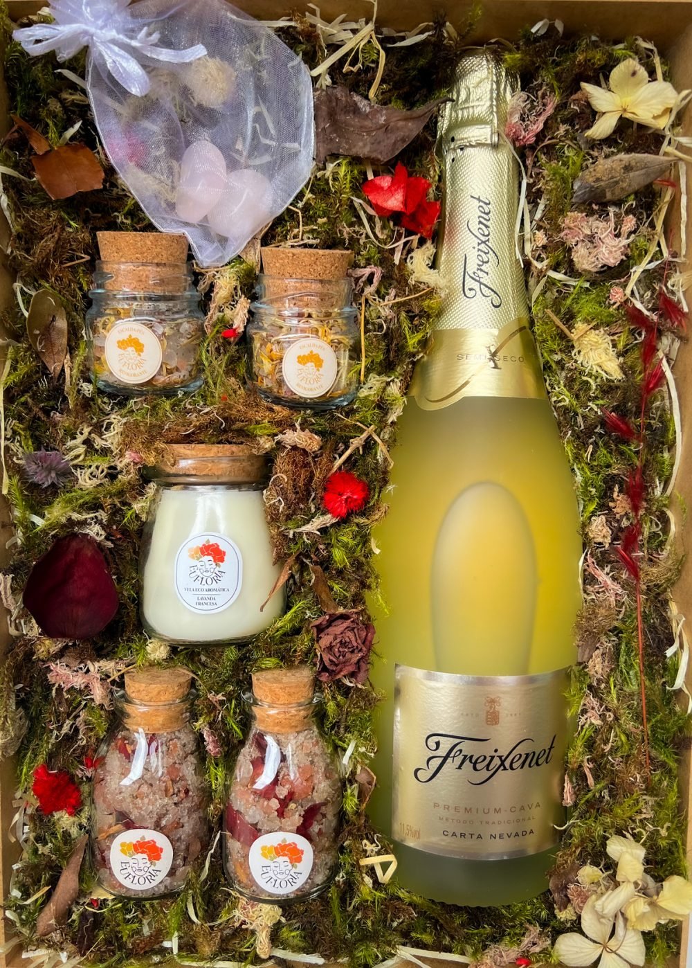 A Decoração da Caixa Afetiva é composta por palhas, musgos, folhas e flores naturais desidratadas e varia conforme as cores e variedades disponíveis.
