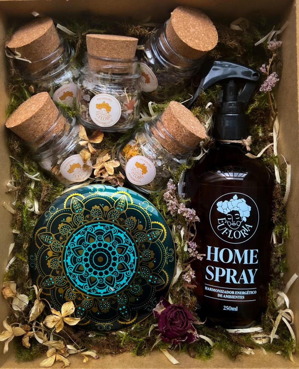 A Decoração da Caixa Afetiva é composta por palhas, musgos, folhas e flores naturais desidratadas e varia conforme as cores e variedades disponíveis.