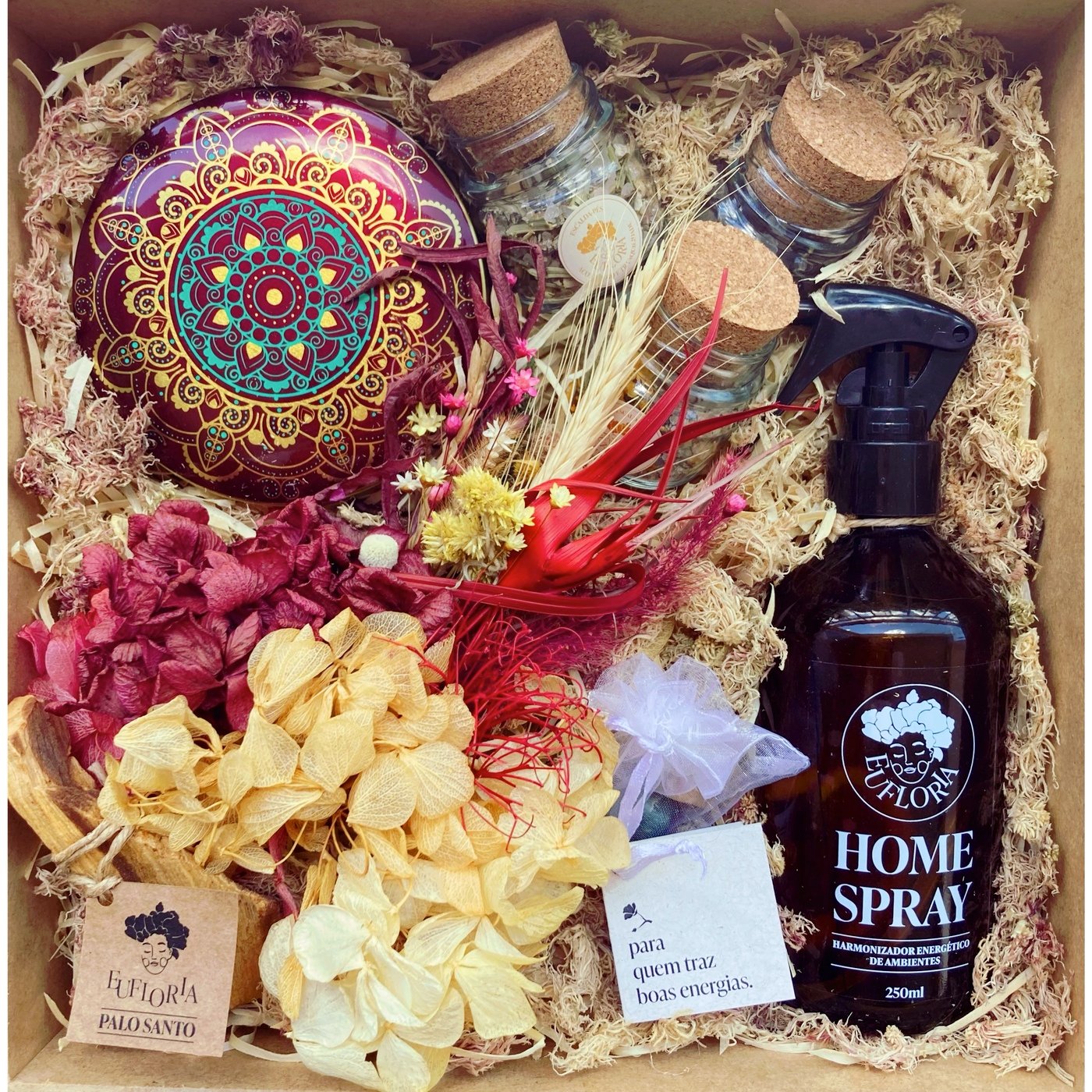 A Decoração da Caixa Afetiva é composta por palhas, musgos, folhas e flores naturais desidratadas e varia conforme as cores e variedades disponíveis.