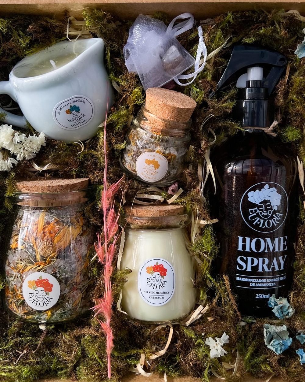 1 Kit Desperte a Deusa em Você: Vela aromática + Vela Massagem Corporal + Banho de ervas 200g: Desperte a Deusa em Você + Escalda-pés: Revigorante + Cristal Pedra da Lua