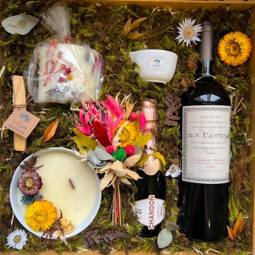 A Decoração da Caixa Afetiva é composta por palhas, musgos, folhas e flores naturais desidratadas e varia conforme as cores e variedades disponíveis.
