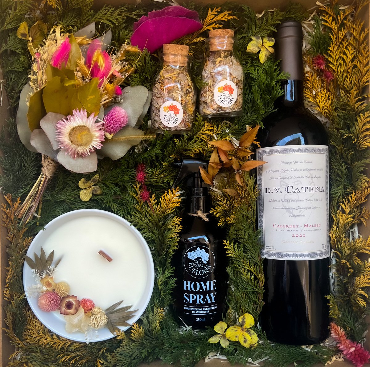 A Decoração da Caixa Afetiva é composta por palhas, musgos, folhas e flores naturais desidratadas e varia conforme as cores e variedades disponíveis.