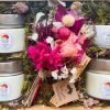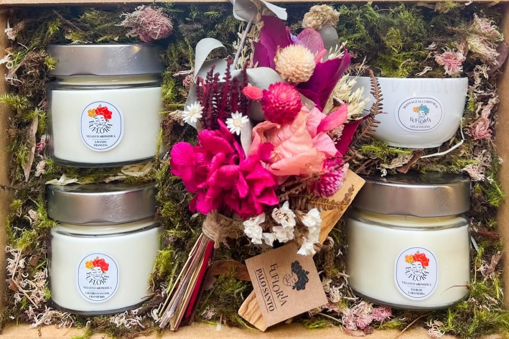 A Decoração da Caixa Afetiva é composta por palhas, musgos, folhas e flores naturais desidratadas e varia conforme as cores e variedades disponíveis.