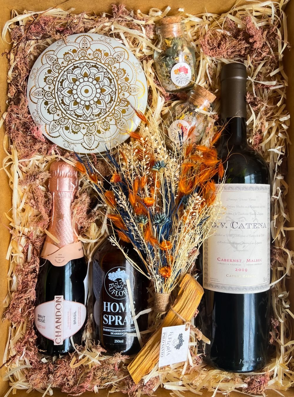 A Decoração da Caixa Afetiva é composta por palhas, musgos, folhas e flores naturais desidratadas e varia conforme as cores e variedades disponíveis.