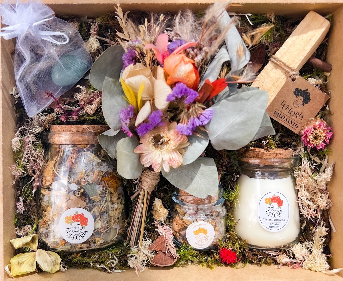 A Decoração da Caixa Afetiva é composta por palhas, musgos, folhas e flores naturais desidratadas e varia conforme as cores e variedades disponíveis.