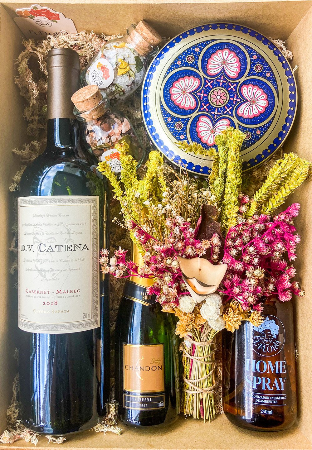 A Decoração da Caixa Afetiva é composta por palhas, musgos, folhas e flores naturais desidratadas e varia conforme as cores e variedades disponíveis.