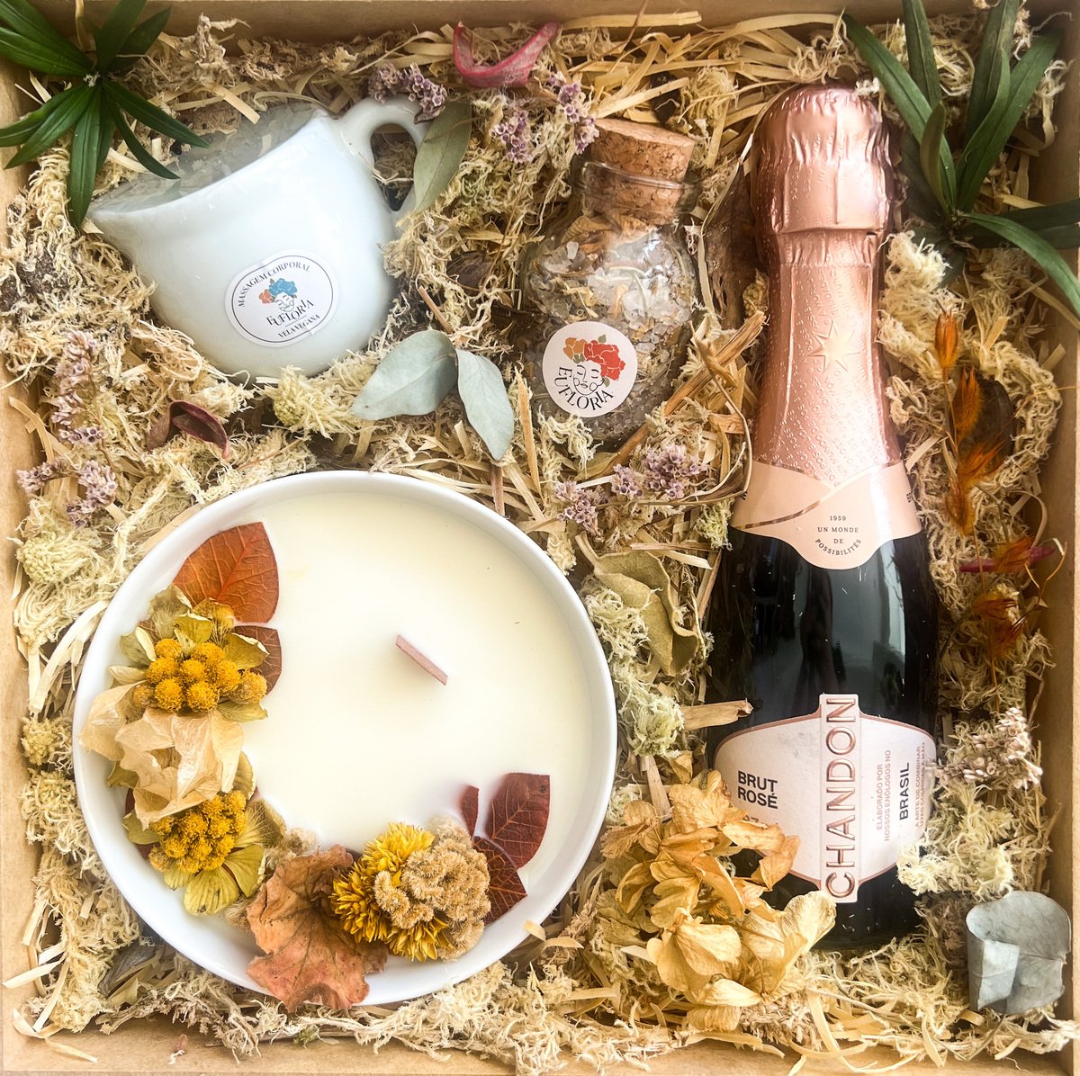 A Decoração da Caixa Afetiva é composta por palhas, musgos, folhas e flores naturais desidratadas e varia conforme as cores e variedades disponíveis.