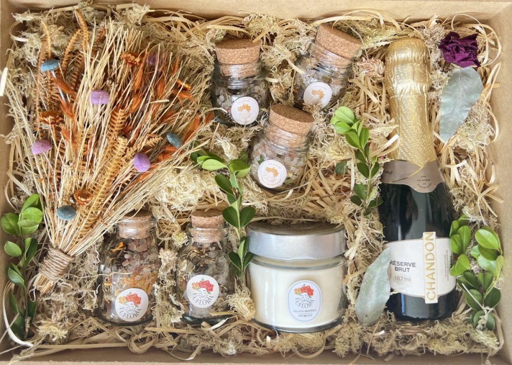 A Decoração da Caixa Afetiva é composta por palhas, musgos, folhas e flores naturais desidratadas e varia conforme as cores e variedades disponíveis.