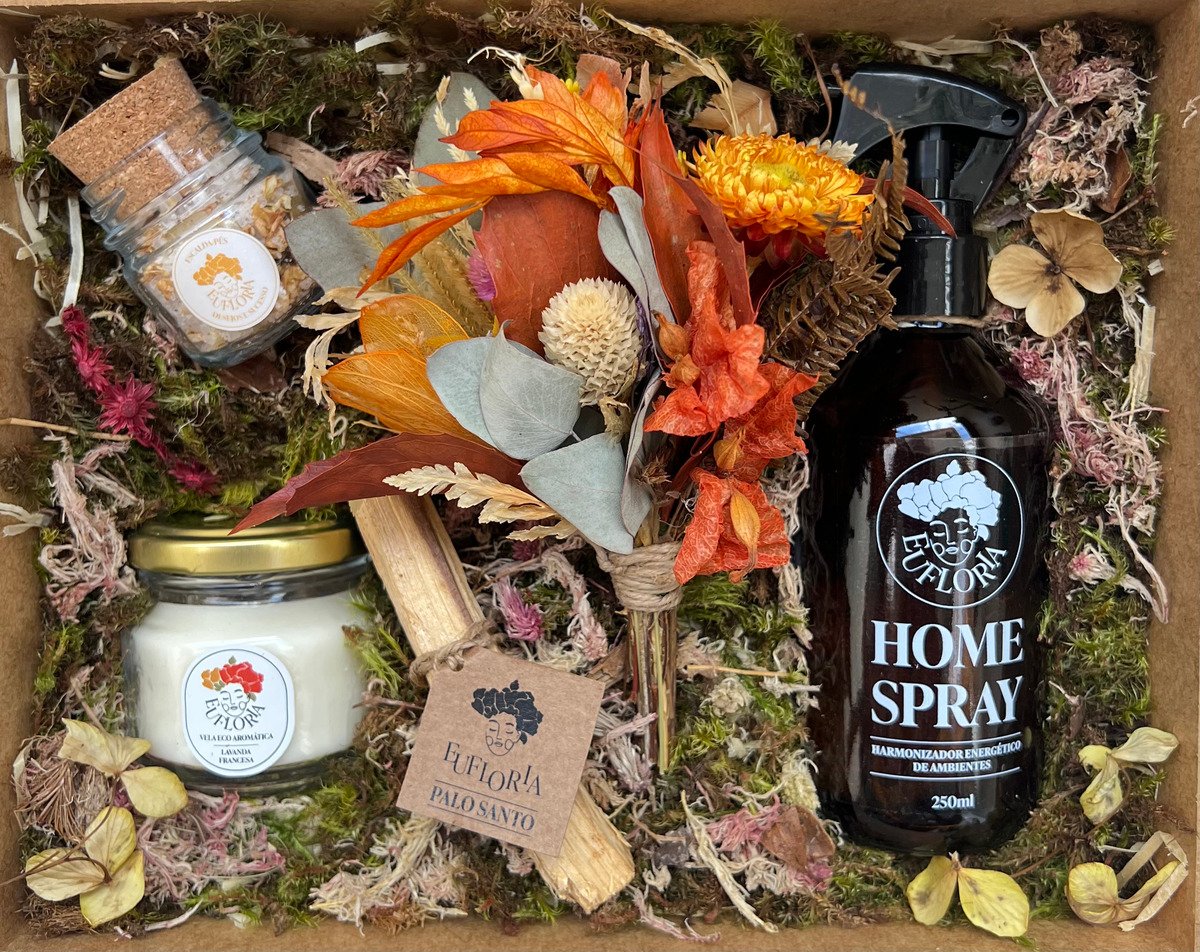A Decoração da Caixa Afetiva é composta por palhas, musgos, folhas e flores naturais desidratadas e varia conforme as cores e variedades disponíveis.