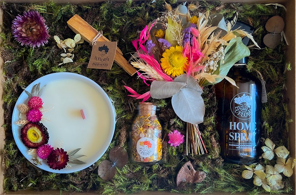A Decoração da Caixa Afetiva é composta por palhas, musgos, folhas e flores naturais desidratadas e varia conforme as cores e variedades disponíveis.