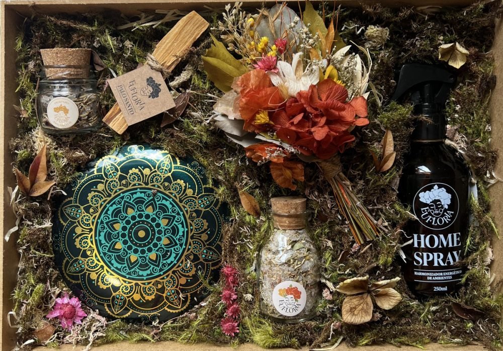 A Decoração da Caixa Afetiva é composta por palhas, musgos, folhas e flores naturais desidratadas e varia conforme as cores e variedades disponíveis.