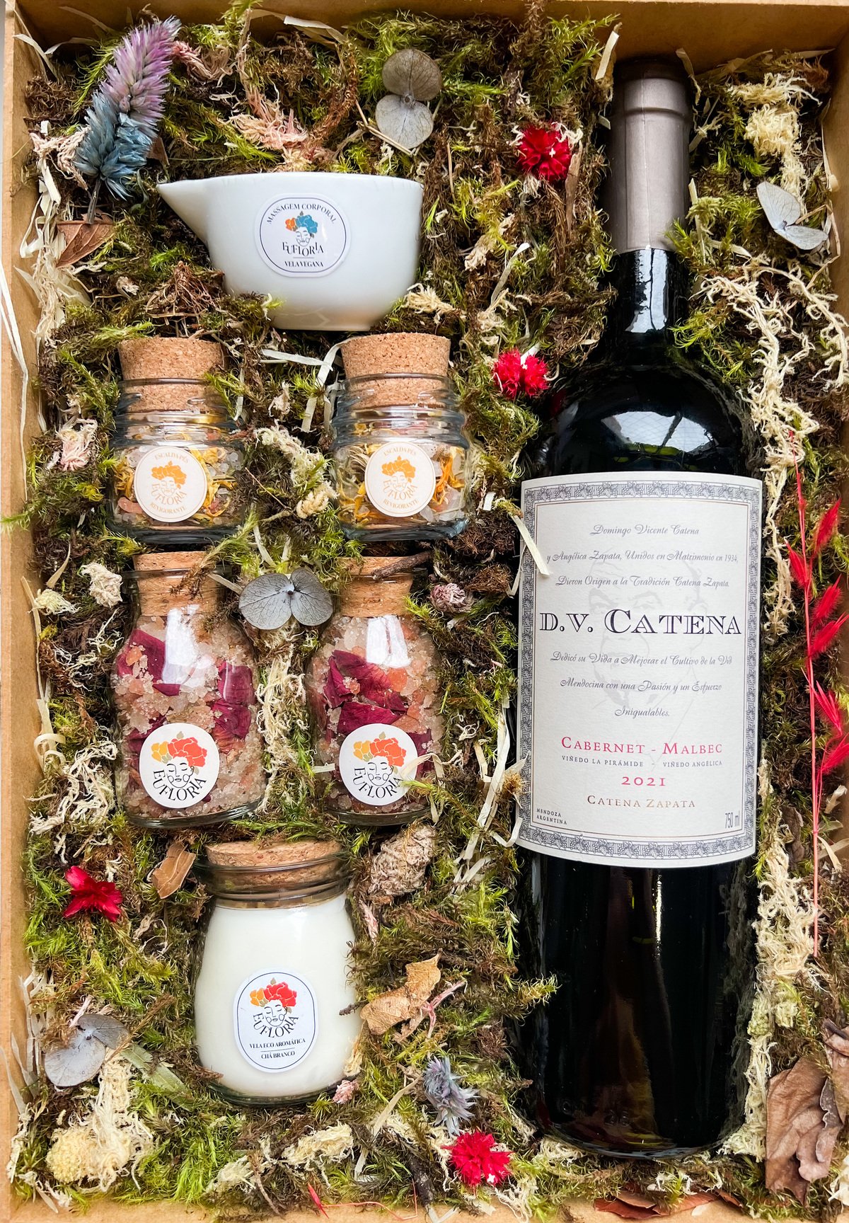 A Decoração da Caixa Afetiva é composta por palhas, musgos, folhas e flores naturais desidratadas e varia conforme as cores e variedades disponíveis.
