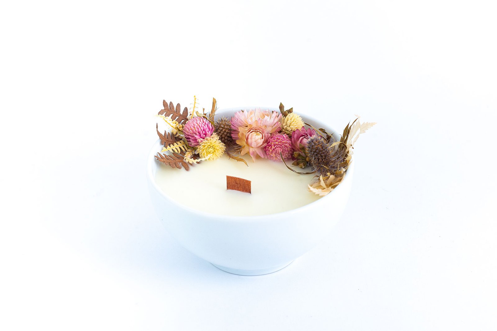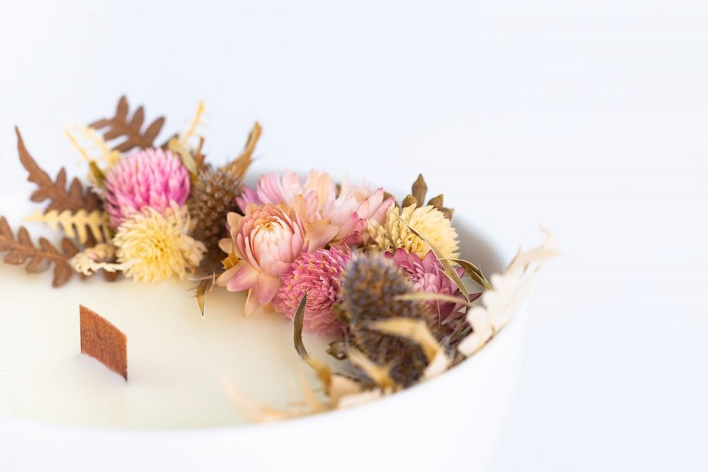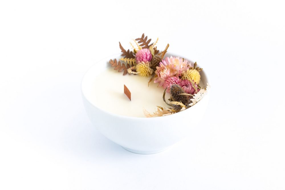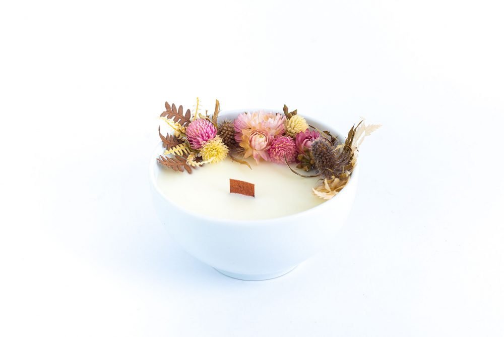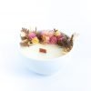Vela ecológica aromática produzida com cera 100% vegetal de coco, em vaso de porcelana, com pavio de madeira e guirlanda de flores naturais desidratadas, esbanja elegância, afeto e acolhimento. Tudo produzido a mão exclusivamente para você.