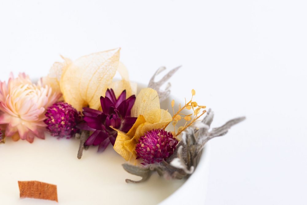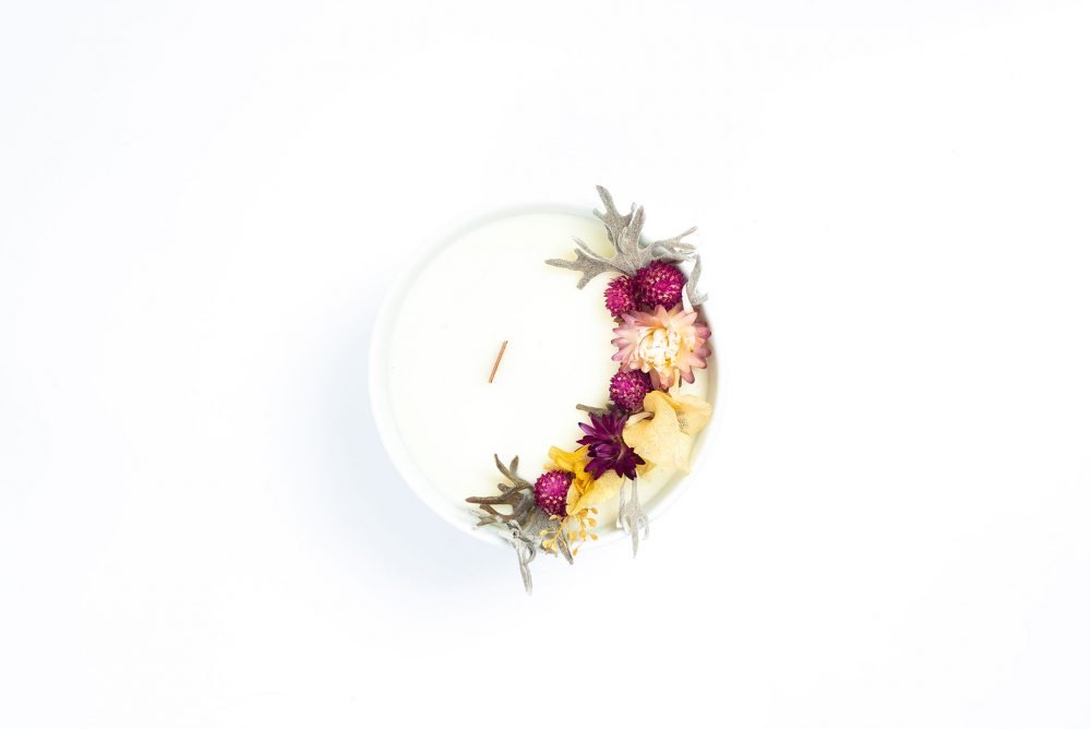Vela ecológica aromática produzida com cera 100% vegetal de coco, em vaso de porcelana, com pavio de madeira e guirlanda de flores naturais desidratadas, esbanja elegância, afeto e acolhimento. Tudo produzido a mão exclusivamente para você.